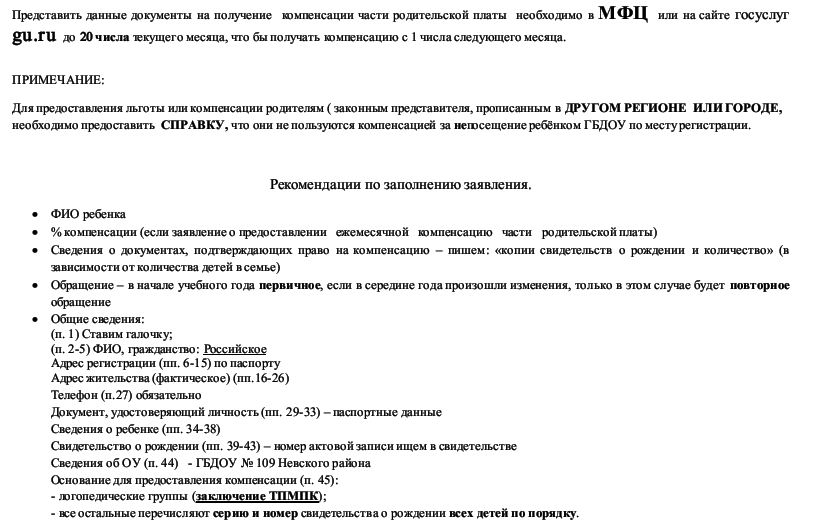 Информацию по предоставлению мер социальной поддержки отдельным категориям семей, имеющих детей, в виде предоставления компенсации родительской платы и части родительской платы за присмотр и уход за детьми в государственных образовательных организациях, реализующих образовательные программы дошкольного образования можно найти во вложении на сайте и в группах ГБДОУ№109.