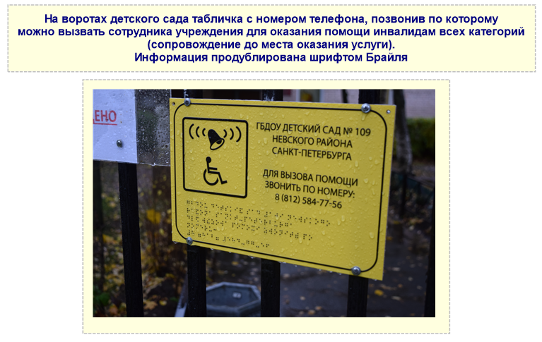 В ГБДОУ №109 разработан Паспорт доступности для инвалидов объекта и предоставляемых на нем услуг в сфере образования. В соответствии с «Программой инструктажа персонала по вопросам, связанным с организацией и обеспечением доступности для инвалидов объектов и услуг», в нашем ДОУ дважды в год, в январе и сентябре, проводятся беседы и инструктажи с сотрудниками с целью создания толерантной социокультурной среды, необходимой для формирования готовности всех членов коллектива к общению и сотрудничеству, к способности толерантно воспринимать социальные, личностные и культурные различия. Обеспечение доступности образовательных организаций для людей с ограниченными возможностями здоровья является одним из приоритетных направлений государственной политики Российской Федерации.